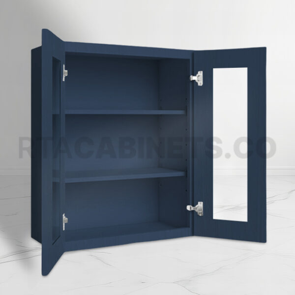 The Blue Shaker 36 H Double Door Wall Cabinet with Glass Doors, offered in sizes of 24″W x 36″H x 12″D and 30″W x 36″H x 12″D, infuses your kitchen with a touch of modern sophistication and elegance. Finished in a striking blue shaker style, this Blue Shaker 36 H Double Door Wall Cabinet with Glass Doors seamlessly complements a variety of interior designs, while the clear glass doors provide a sleek view of your stored items, enhancing both style and functionality.