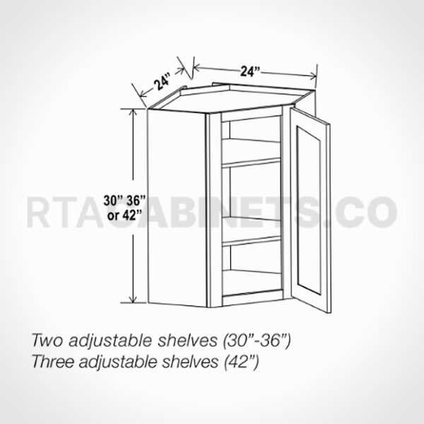 The Charleston White Raised Panel 24 Diagonal Corner Wall Shelf is designed to enhance both the style and functionality of your kitchen. Offered in dimensions of 24″W x 30″H x 12″D, 24″W x 36″H x 12″D, and 24″W x 42″H x 12″D, this shelf fits perfectly into corner spaces, making it an excellent choice for optimizing your kitchen layout. Its elegant Charleston white finish and classic raised panel design provide a sophisticated touch that complements any decor.