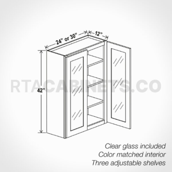 The Charleston White Raised Panel 42 H Double Door Wall Cabinet with Glass Doors, available in dimensions of 24″W x 42″H x 12″D and 30″W x 42″H x 12″D, adds a refined touch of sophistication and modern elegance to your kitchen. Finished in an exquisite Charleston white, this cabinet features stylish glass doors that showcase your kitchenware while blending form and function seamlessly into any décor. The clear glass panels enhance visibility and create an airy feel, making it easy to keep your essentials organized and accessible.